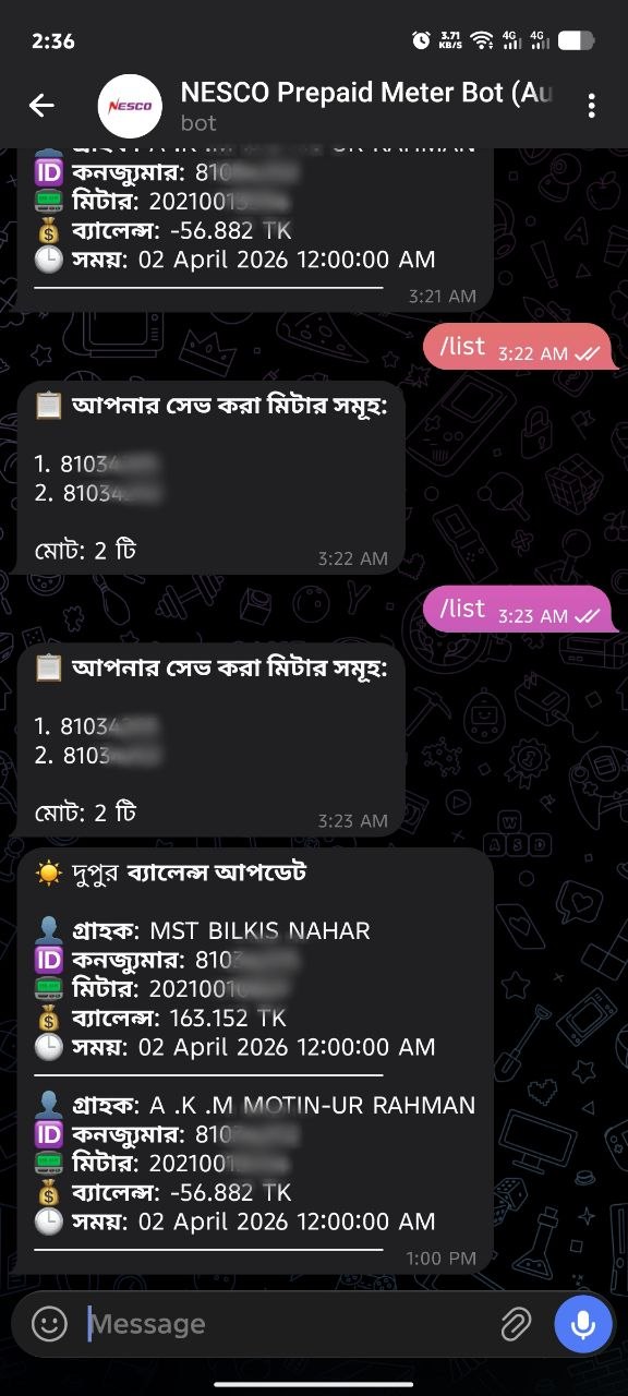 Track your NESCO prepaid meter instantly. Get automatic notifications and manage multiple accounts with our intelligent Telegram bot. Zero hassle, maximum convenience.
